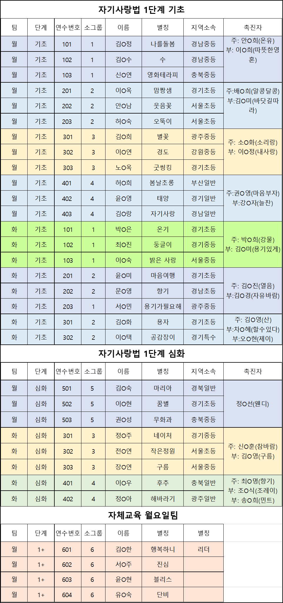 교사를 위한 자기사랑법 2023년 1월(20차)연수 모둠 배정입니다.