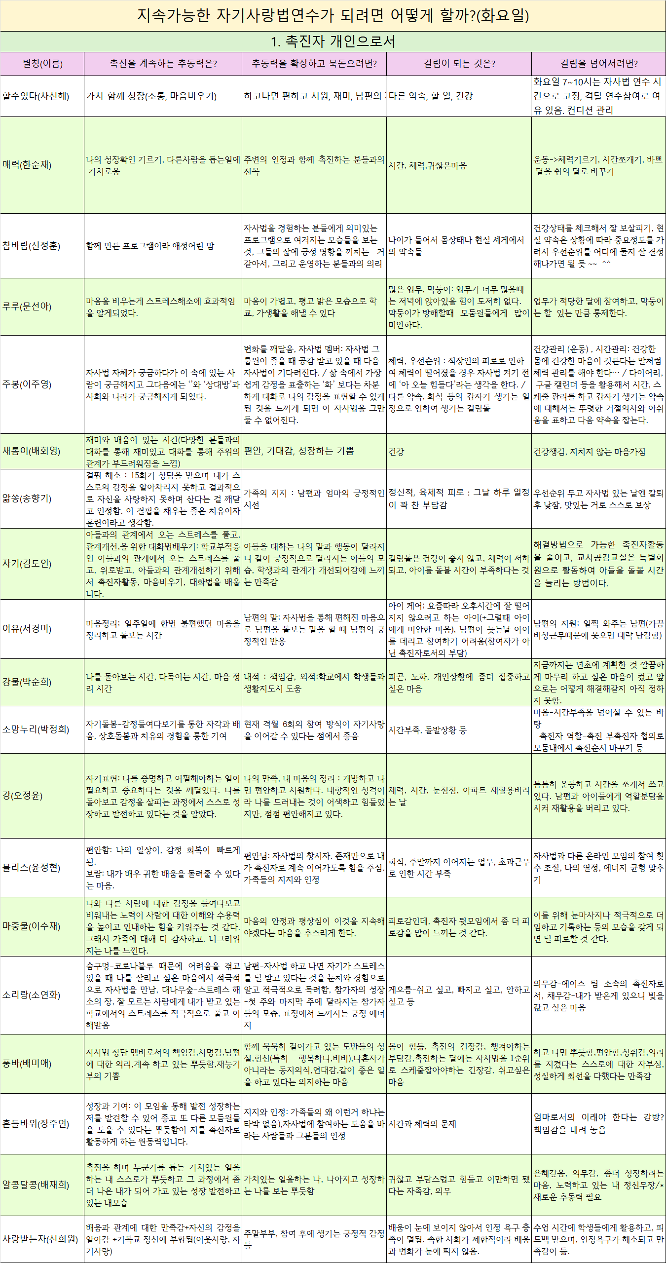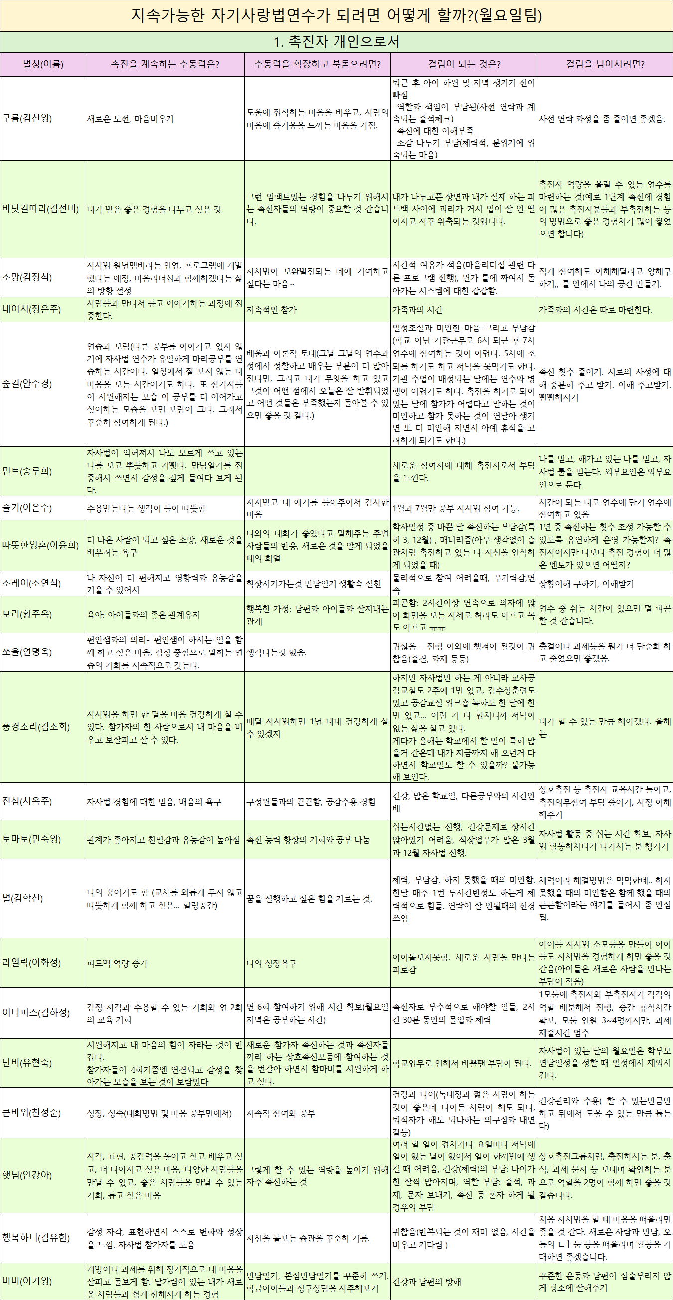 월요일팀 지속가능한 자기사랑법연수가 되려면 어떻게 할까?(월요일팀) 1. 촉진자 개인으로서 별칭(이름),촉진을 계속하는 추동력은?,추동력을 확장하고 북돋으려면?,걸림이 되는 것은?,걸림을
