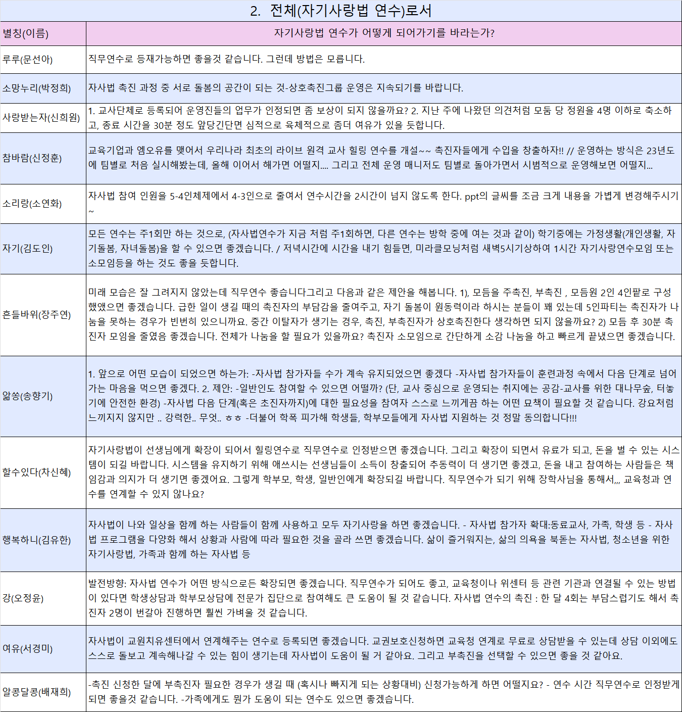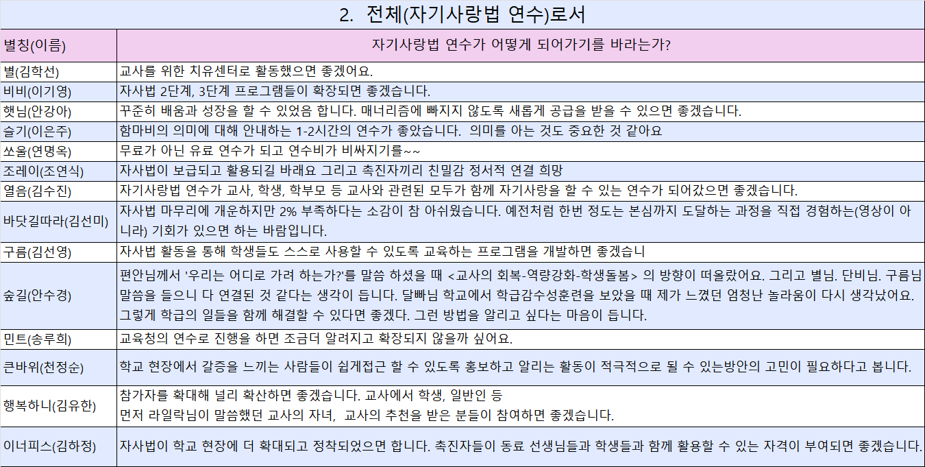 지속가능한 자기사랑법연수를 위한 촉진자 의견(월요일)