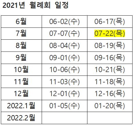 - 아래 월례회 일정을 보고 자신의 발표 희망 날짜를 위의 구글 스프레드시트에 기록하세요. 스프레드시트 맨 아래 줄에 자신의 희망 날짜를 올리고, 단톡방에 올렸다고 알리셔요. 담당자(참바람 신정훈)가 안내드리고 필요시 조정의논 드립니다.