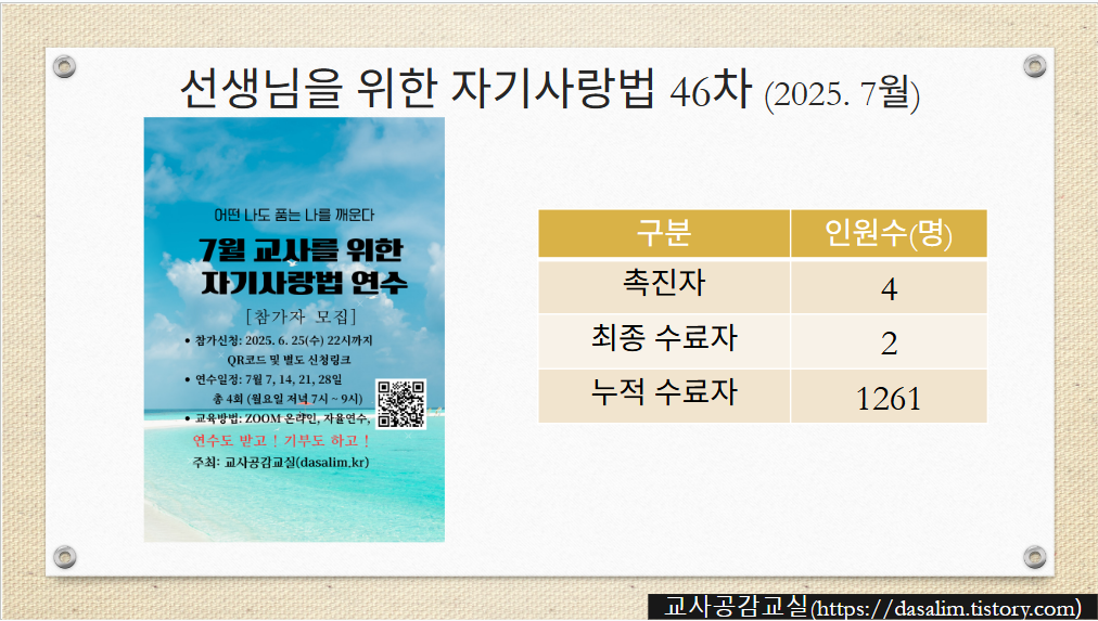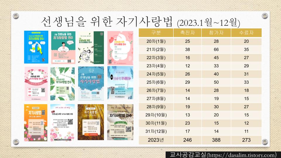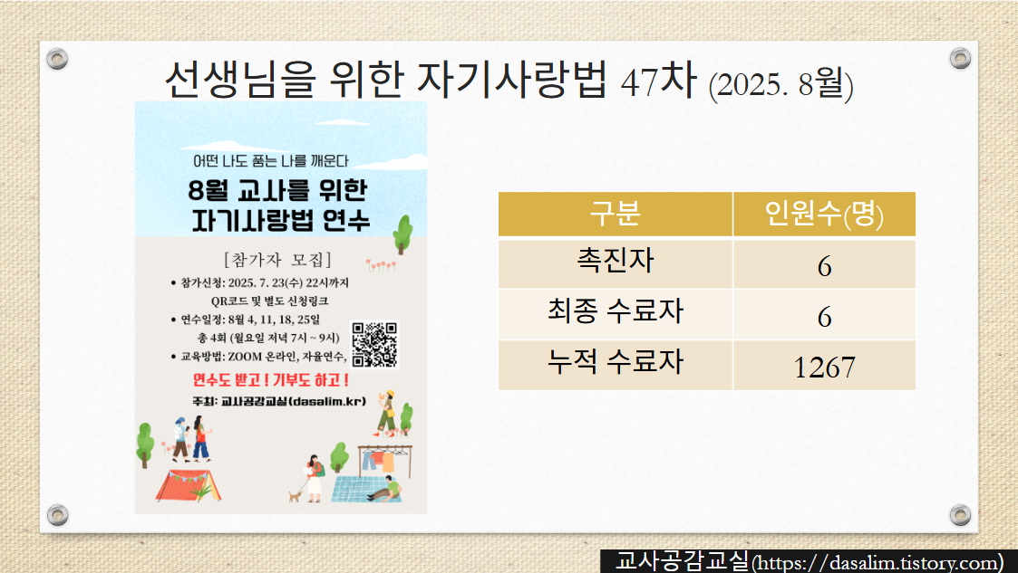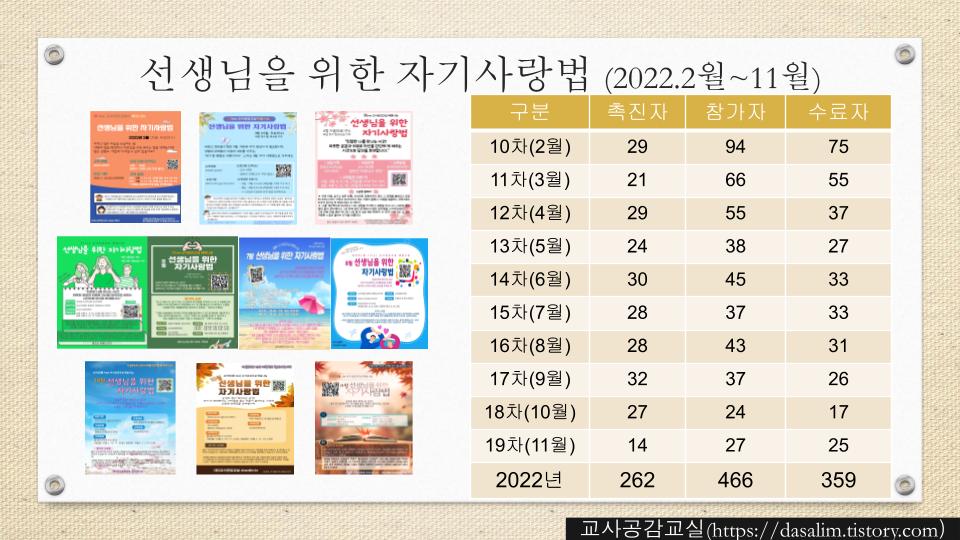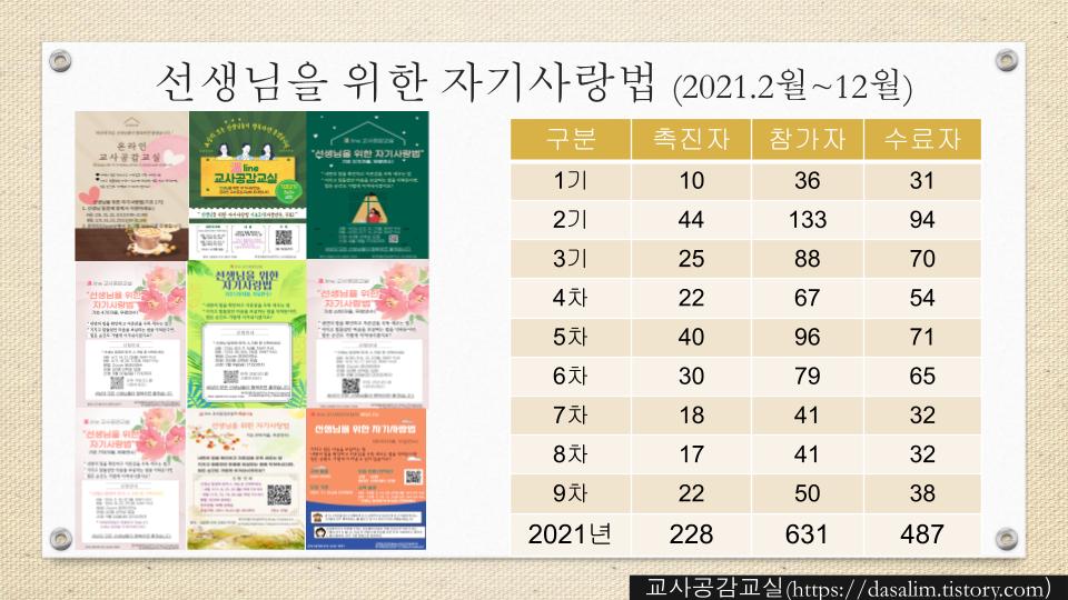 ▶ 제1차 자기사랑연수(2021. 2. 8.~) 부터 50차 연수(~2025. 12. 22.)까지 총 1276명이 수료했습니다. 현재 1월 교사를 위한 자기사랑법 연수가 1.5.(월)부터 운영되고 있습니다. 2월은 쉬고 3월부터 연수가 다시 운영됩니다.