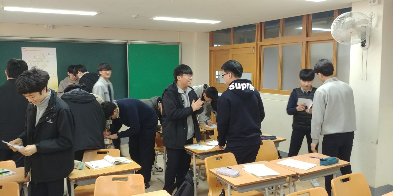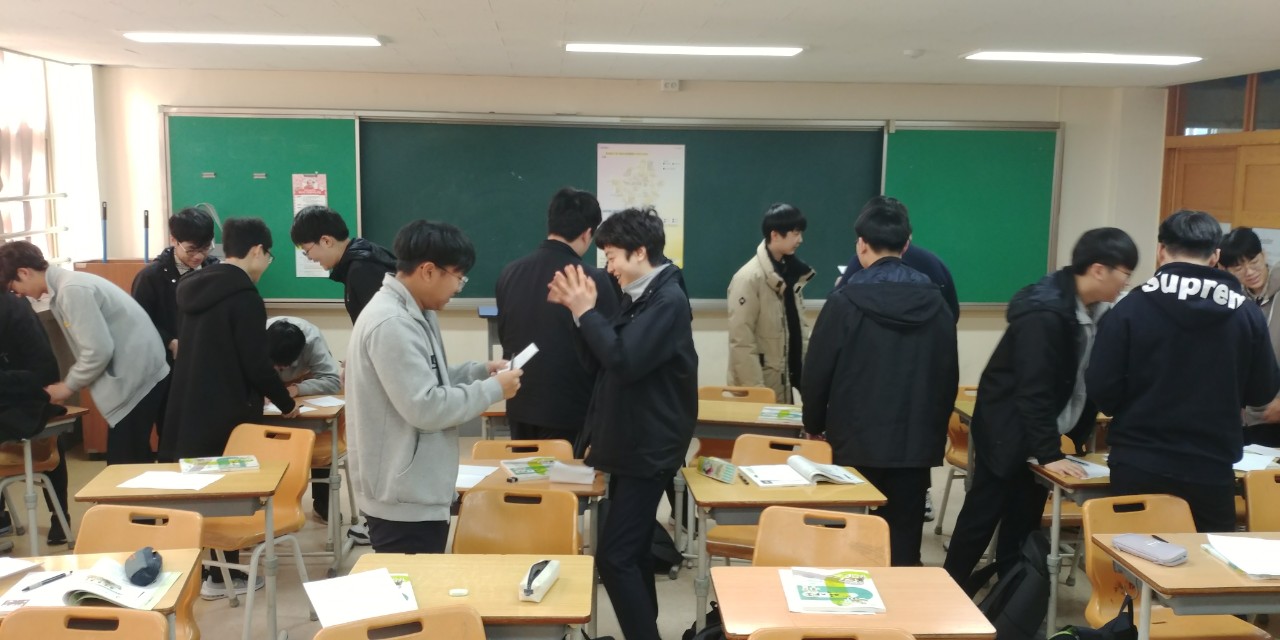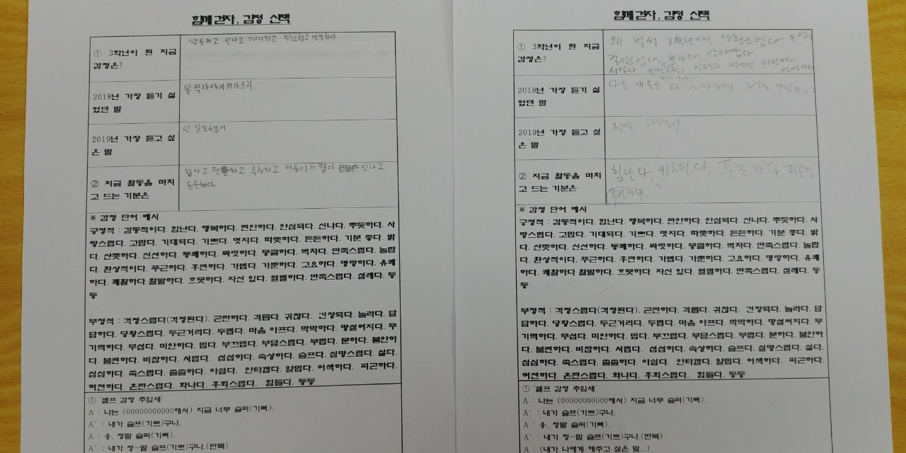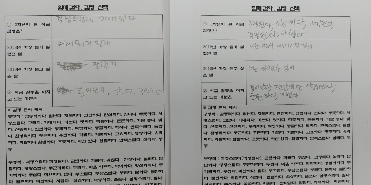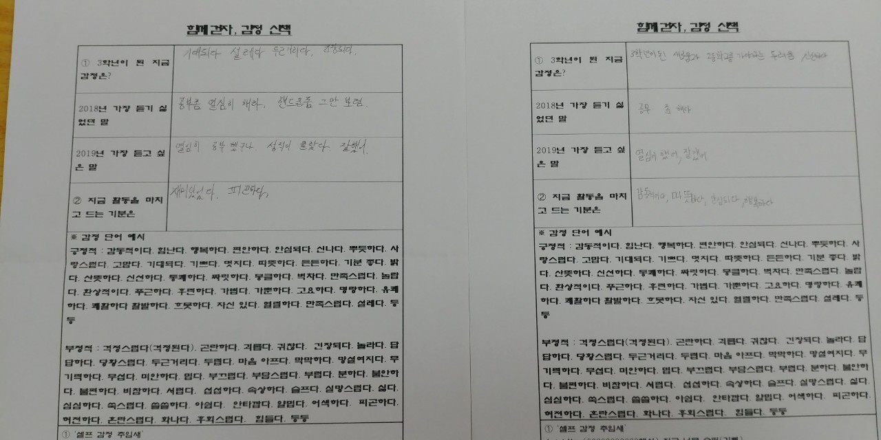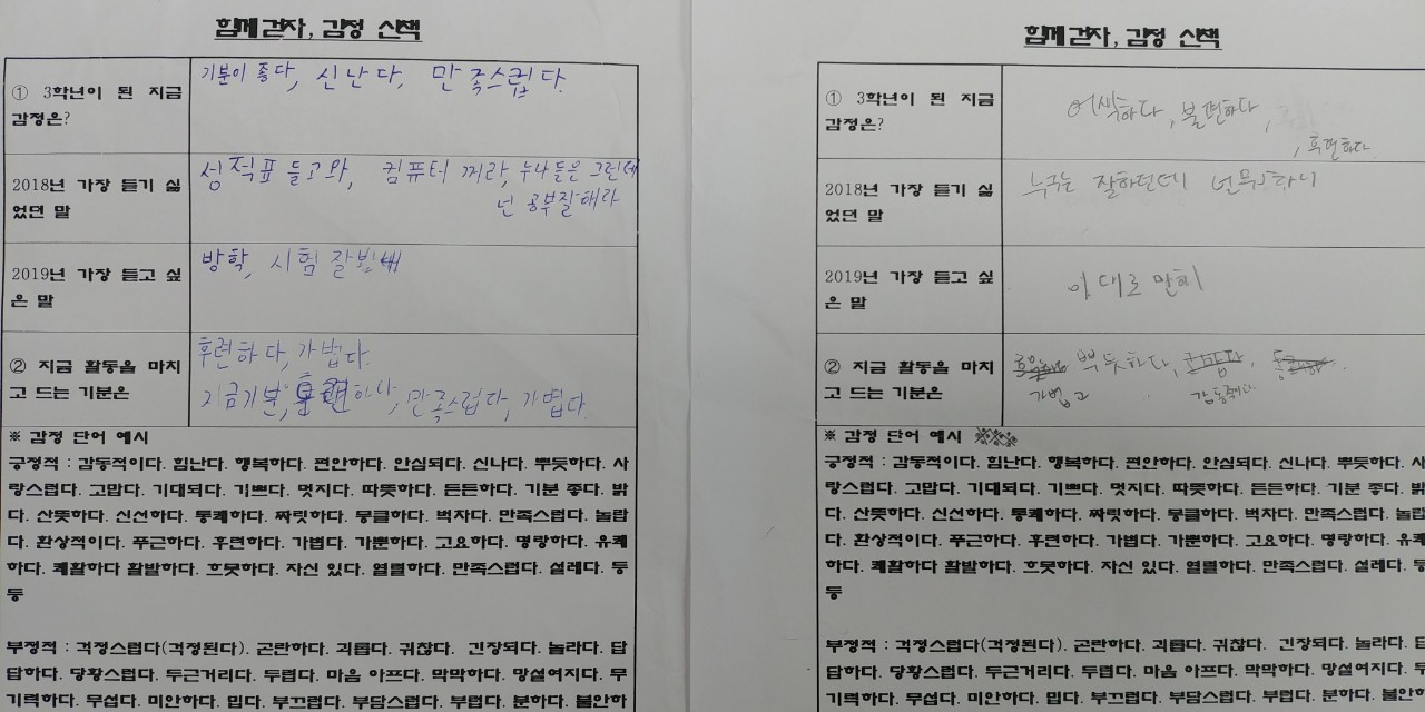 학기초 수업 대신 친교활동으로 감정산책과 자기칭찬 활동을 했습니다. 자기칭찬 활동으로 교실 곳곳을 돌아다니며 낯선 친구들을 만나고 신나게 떠들었습니다. 그리고 감정산책 활동으로 중3이된 지금의 심정과 작년에 듣기 싫었던 말과 올해 듣고 싶은 말을 함께 나누고 감정 추임새 넣어주고 마지막으로 활동을 마친 지금 기분 나누고 마무리 하였습니다..활동을 마친 후에 아이들의 긍정 감정이 크게 늘어났습니다..저는 기쁘고 뿌듯하고 홀가분하고 아이들은 든든하고 신뢰로웠습니다. 참 고맙고 귀한 아이들입니다..