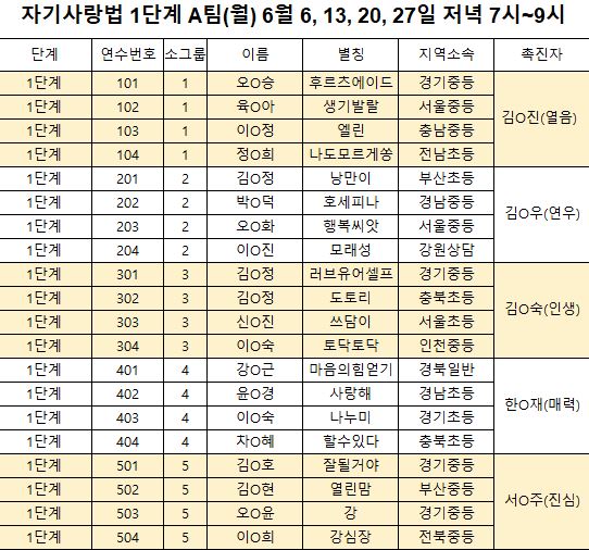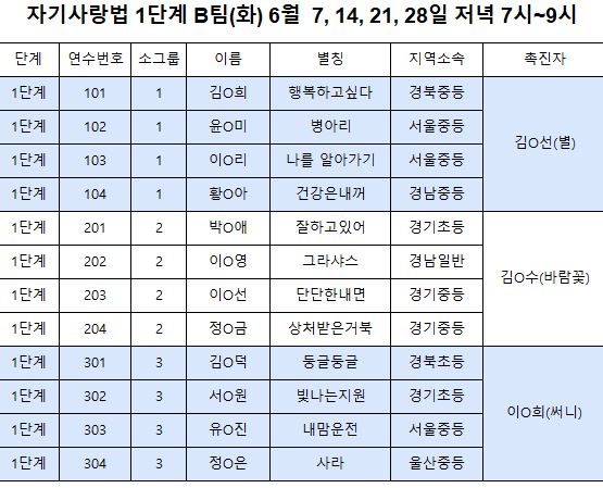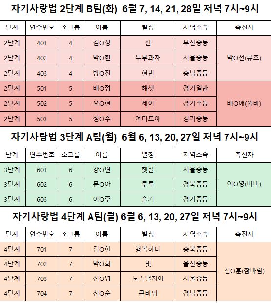 교사를 위한 자기사랑법 6월(14차)연수 모둠 배정입니다.